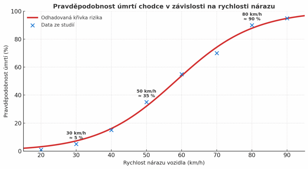 Již při 30 km/h je pravděpodobnost úmrtí kolem 5 %, při 50–60 km/h už stoupá na 30–50 % a při 80 km/h se blíží 90 %. Autoři upozorňují, že každé zvýšení rychlosti o pouhý 1 km/h zvyšuje riziko smrti chodce v průměru o 11 %.